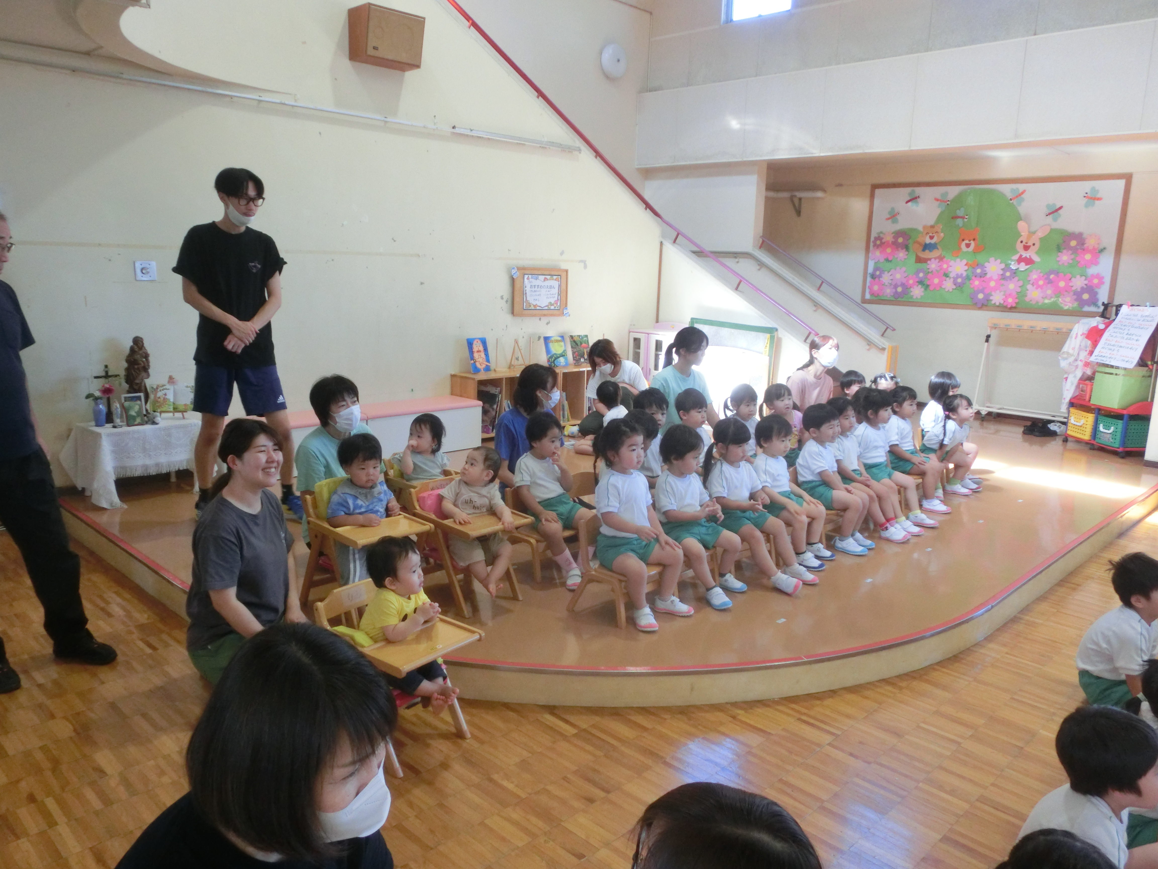 今日は、久しぶりにおじいちゃんおばあちゃんを園にお招きして、敬老の集いをしました。たくさんの方にご参加いただき、和やかな雰囲気の中で過ごしました。